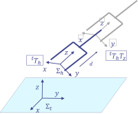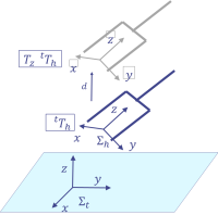 逆に,ハンド座標の座標変換行列$^tT_h$に対して左から$T_z(d)$を掛けると 3) 図8のようにテーブルのz軸にそって$d$移動する.