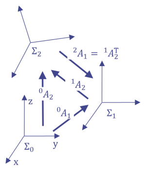 また式(2)と式(3)から $$ ^0\boldsymbol{v} = {^0A_1}{^1A_2}{^2\boldsymbol{v}} \tag{4} $$ となることが分かる.これはまた $$ ^0A_2 = {^0A_1}{^1A_2} \tag{5} $$ であることを示している. このように参照座標系によるベクトルの成分表示の変換や直交行列による座標系の表現は直交行列の積の形で 連鎖させて計算できることが分かる(図3).
