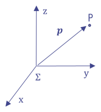 始点を座標系の原点とするベクトルで空間中の位置(たとえば点P)を指し示すことができる.これを位置ベクトルと呼ぶ(図3).